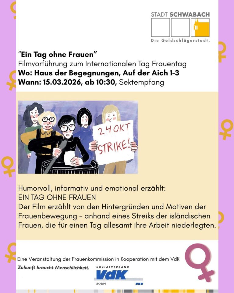 Anlässlich des Tages, wird am 15.03.2026 bei uns im Haus der Begegnungen, der Film „Ein Tag ohne Frauen“ gezeigt. Organisiert von der Frauenkommission in Kooperation mit der VdK. Dieser Dokumentar Film (Original: The Day Iceland Stood Still), erzählt vom isländischen Frauenstreik 1975, bei dem 90 % der Frauen ihre Arbeit niederlegten, um für Gleichberechtigung und gleichen Lohn zu kämpfen. Der Tag legte das Land weitgehend lahm und wurde zu einem wichtigen Meilenstein für Frauenrechte. Aber kommt vorbei uns schaut es euch selbst an!